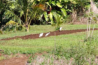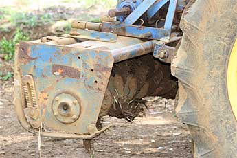 This row is inset from the outer row of ironwood trees (off screen on the right) which will be the wind break. it has been tilled and plastic mulch layed in. The first step is to poke a hole through the plastic with an iron bar and make an opening into the soft dirt for the tree.