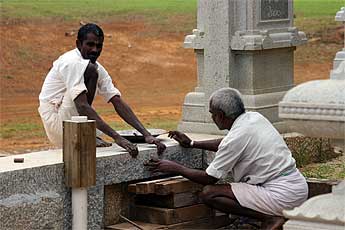 Shanmuga Sthapati and one of the silpis demonstrate carving...