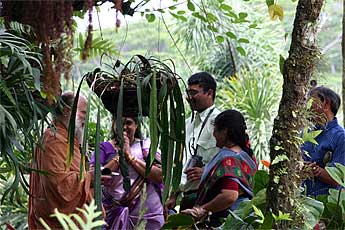 The two couples chat with Siva Katirswami outside. They are amazed at the beauty of the Aadheenam, which is in full bloom now as spring is all around us. A rare anthurium hangs in the basket, with its pong, drooping leaves.