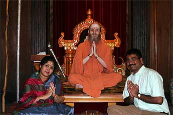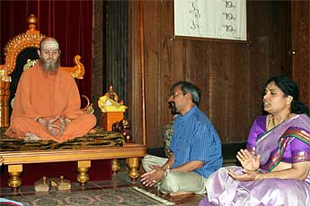 (from yesterday) Sarma and Ambika are visiting from San Jose, California, with their friends. After a tour of the grounds and of Iraivan Temple they met with Bodhinatha. They began their meeting by beautifully singing two bhajans for Bodhinatha.
