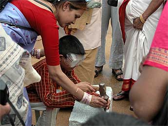 At the Iraivan Temple foundation several of them gleefully tried out chipping some granite stone.