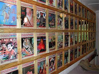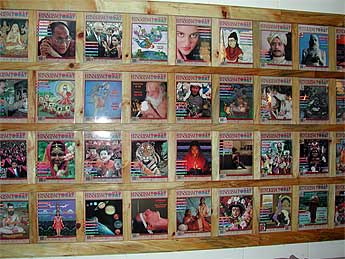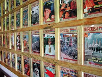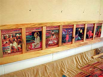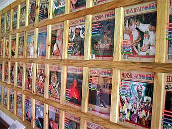 We installed a "Wall of Covers" of Hinduism Today, stretching back in time to the first New Saivite World. Gurudeva founded it on January 5, 1979 and the first issue came off the press in February, printed by the monks on a small press in what is now our cafeteria! It was black and white, and the photos were so bad (really) that one could sometimes only tell what was in them by reading the captions! But it did make us good caption writers, so there is a blessing in everything.