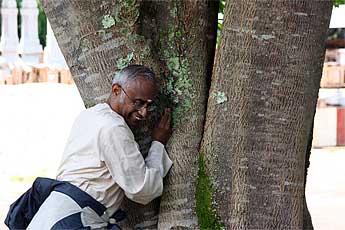 Mr. Padmanaban hugs a rudraksha tree