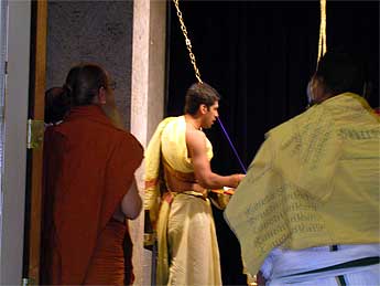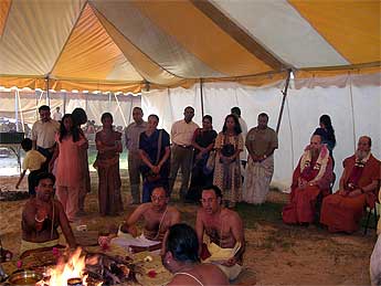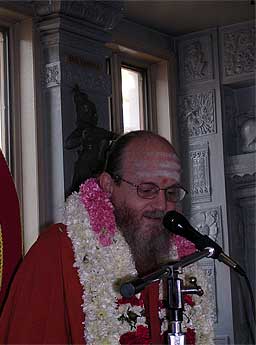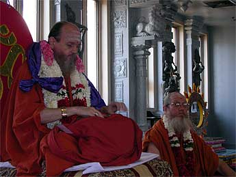 We welcomed Bodhinatha at the temple in the evening where Satguru was honored at the inner sanctum sanctorum of both the Siva and Vishnu temples, by the temple's Saiva and Vishnu priests. After the honorary ceremonies for the guru, the current temple president gave a very beautiful thoughtful introduction of Bodhinatha. He asked us to visualize as if we were there on the 10th day of Gurudeva's pravopavesha fast when "�Gurudeva removed one of his rings and placed it on his successor's finger stating that his name would be Satguru Bodhinatha Veylanswami, " Gurudeva placed the bracelet on Bodhinatha's wrist and declared you are the Guru now!" This beautiful introduction by the temple president, gave a meaningful introduction that helped the devotees at the temple, who had very little exposure about Bodhinatha, as to his background and his lineage.