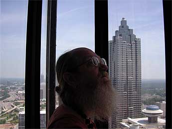 Shanmuganathaswami, looking out into the Atlanta Skyline from the Westin Glass Elevators.