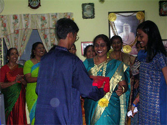 The eldest amma, Kulamata Rajaletchumi, being honored by her children.