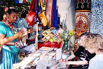 Recently, the Golden Gate mission of California set up a table to offer free Hindu literature to attendees at the annual Himalayan Fair in Berkeley, not far from the University. Here is Chandran Param, the principal organizer, with his four children at the commands, welcoming browsers answering their questions and offering them free literature published by Himalayan Academy--Hinduism Today, Hindu teaching-tool booklets and more.