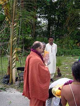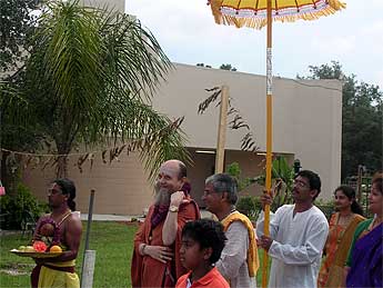 The Hindu Temple of Orlando president, Mala Karkhanis, and devotees give Satguru a grand welcome, as he arrives in the limo with Sadhaka Haranandinatha.