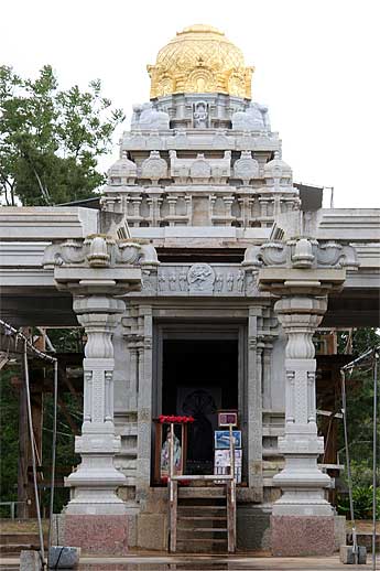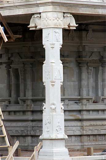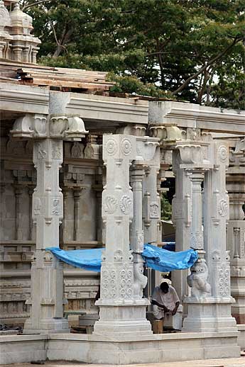 Saravananathaswami showed me around the temple-in-construction, pointing out different design touches and describing what the building will eventually look like. Remarkably, the pieces of granite are being assembled without use of modern machinery or materials. Instead, they re held together by gravity.
