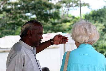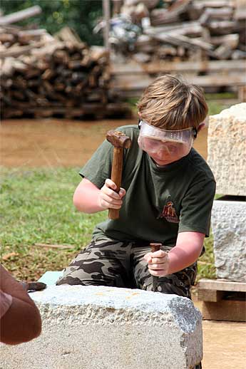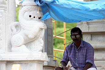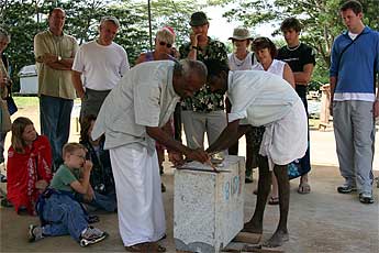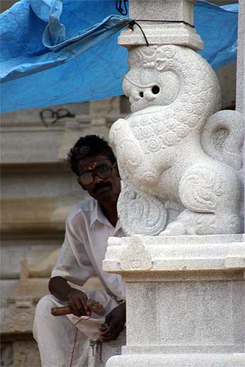 Saravananathaswami led me along a footpath to the site of the new Hindu temple, and I heard a gentle tap-tap-tapping playing through the air like a musical prayer. Soon I saw the source of the sound. A small group of Indian craftsmen were rhythmically pounding enormous pieces of granite by hand, preparing them for placement in the temple. I touched the smooth white blocks, each carefully numbered, and held a few of the soft iron tools in my hands, marveling at the patience required for such a task.