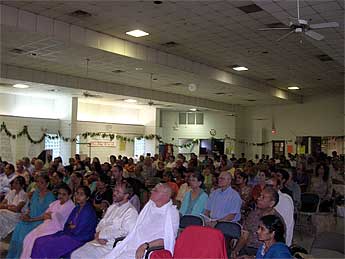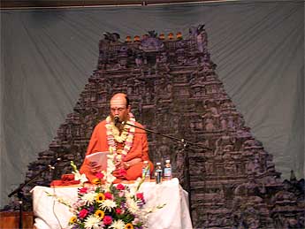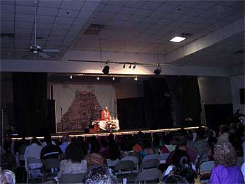 Here is Bodhinatha in the evening at the temple in Florida... giving a talk to a several hundred devotees in the auditorium. (story continues further down...)