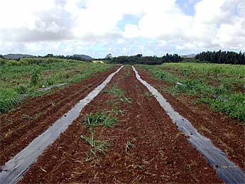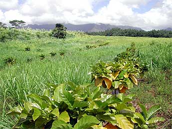 We are harvesting already about ten pounds of fruit a week from the 40 or so two-year-old plants. Noni is a native Hawaiian medicinal fruit and well adapted to our soil. Of course, so is the guinea grass you see growing between the rows!