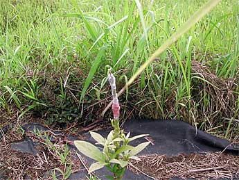 This is a red cedar tree which was planted in January and has really gotten off to a good start. Red cedar is a fast growing tree, with a medium value wood. It is part of a test plot to see what trees grow happily here.