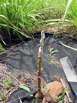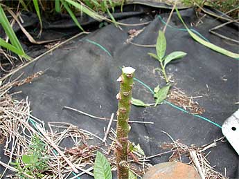 Four weeks ago we grafted about 60 avocado trees which had been planted about 18 months ago from seed. It's difficult to see, but the little bud at the very top of this plant shows the graft has taken. The new growth below the bud is removed to force the tree to put all its energy into the graft. Amazingly, given our lack of experience, 55 of the 60 grafts had taken, and of the five that failed, two had been knocked off, likely by wild pigs.