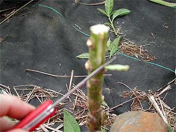 Grafting the young avocado starts rather drastically, cutting it off completely about a foot from the ground.