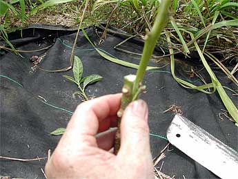 Sorry for the blurry photo, as the camera didn't know what to focus on. This shows the cutting away of the bark for a side veneer graft.