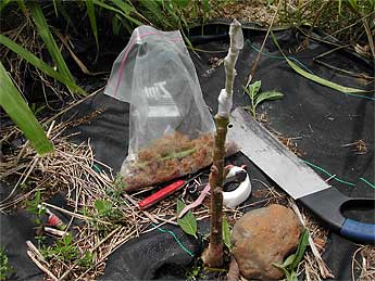 It is then wrapped in parafilm, a paraffin wax product recommended to us by Satya Palani. In the back you see the bag of scion pieces, kept moist with peat moss, the cutting saw, grafting knife, rubber band and par