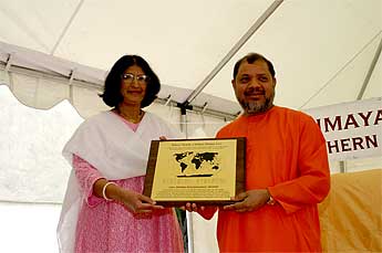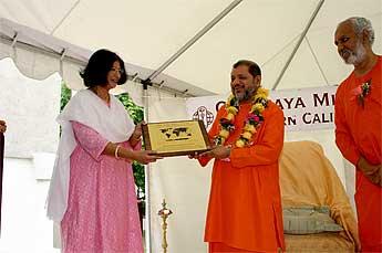 Swami Tejomayananda receives the Hindu Renaissance Award from Hinduism Today. Presented by Hinduism Today correspondent, Archana Dongre at the recent opening of the new Chinmaya Mission center in Los Angeles.