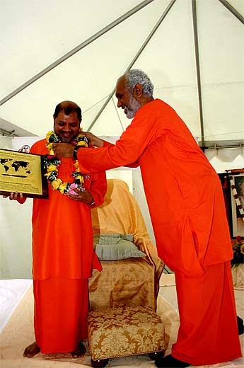 "2005 Hindu Renaissance Award Presented by Hinduism Today to Hindu of the Year, 2005, Sri Sri Swami Tejomayananda, spiritual leader of Chinmaya Mission Worldwide, for fulfilling the vision of his guru, Swami Chinmayananda, guiding the Chinmaya Mission's exemplary teaching programs, inspiring the dynamic expansion of the monastic order (including new swamis from the diaspora) and teaching hundreds of thousands to be better Hindus."