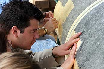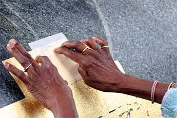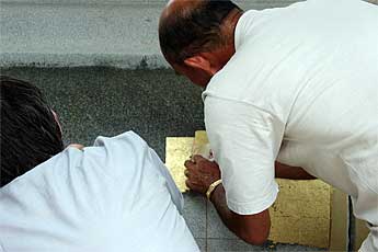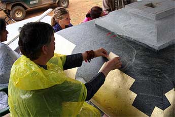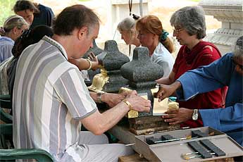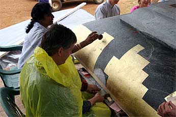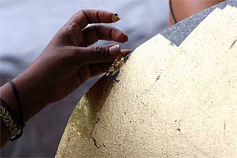Koviloor Swami sits at the temple site watching the gold leaf work... a technology he may take back to India.