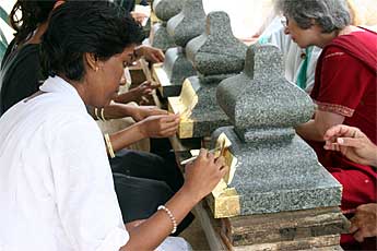 That afternoon, all the members and many of the monks were focused back at the Iraivan temple. A big team worked on gold leafing the capstone of the West Chinna Gopuram.