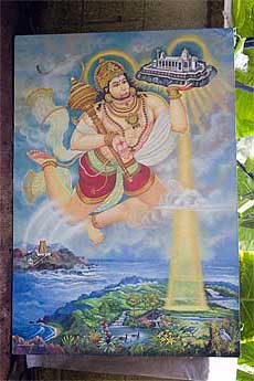 Now that the ceremonies are over... we are all back to work. Yesterday's retreat day was "Iraivan Day" and the monks were all focused on various projects. One was to get a lot of posters prepared for up-and-coming fund raising events. We are not sure if we ever showed you all this amazing painting by A. Manivel, showing Hanuman carrying Iraivan from India to Kauai...