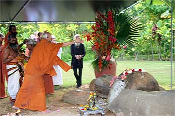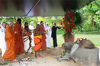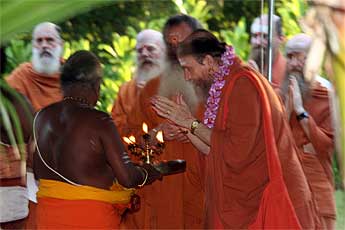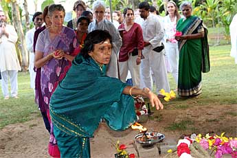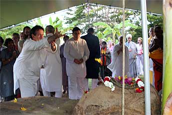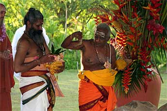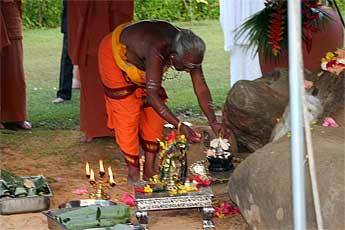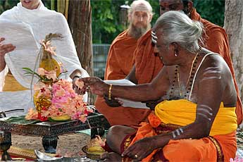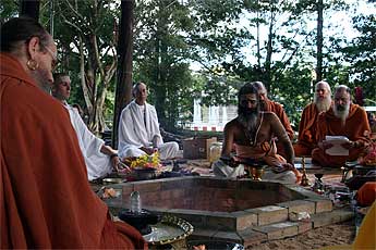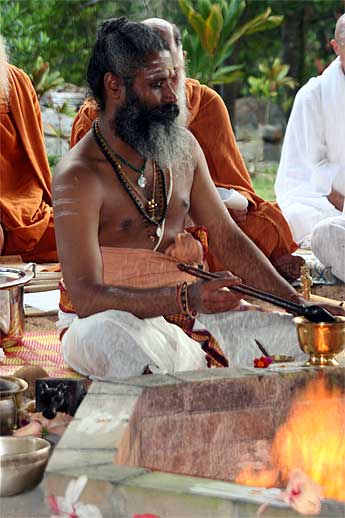 A big fire is raised by our two Kurukkals. This is Kandasamy Kurukkal who also came for the first stone placing of Iraivan Temple in 2001.