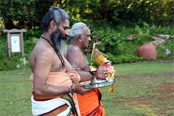 The graceful Nrityaraja Kurukkal energizes the kumbha. Today he came to visit us in the publications building. He said he has been doing pujas for over 70 years! He is from Jaffna, Sri Lanka.
