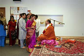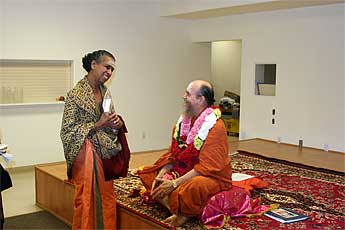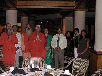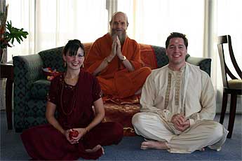 Later that evening just before Bodhinatha headed out to another temple visit he stopped briefly in the hotel restaurant to meet with some devotees. Among them are Mark and Lindsay Boyer who drove down from New York and Julie Rajan, who writes for Hinduism Today.