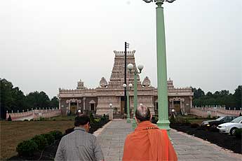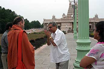 Dr. Shirish Parekh leads Bodhinatha to the temple entrance. It is a beautiful, large traditional South Indian style temple set on a 10 acre parcel.