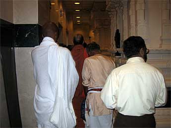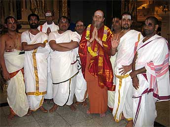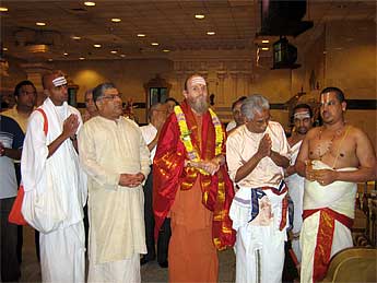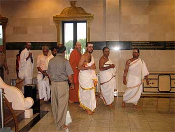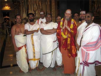 Saiva and Vaishnava priests greet Bodhinatha inside the temple.