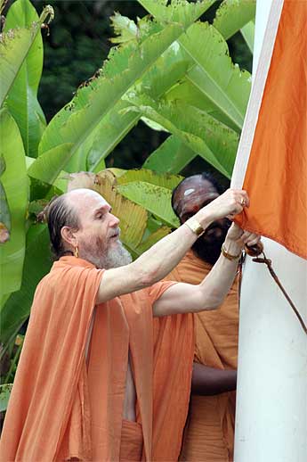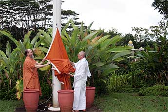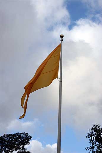 The Aadheenam's 60-foot flag pole flies the rust-colored dhvaja, symbolizing environmental care. Copper-maroon and all shades of red adorn our smaller flags.