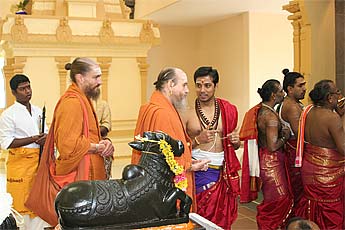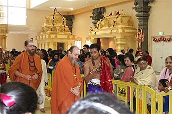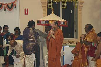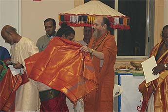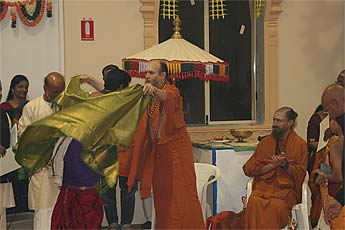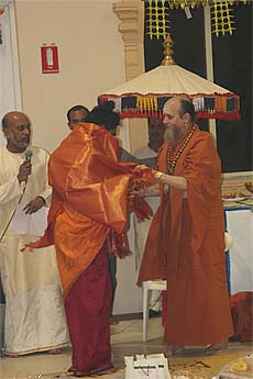 Bodhinatha is in transit today (September 9th) on his way back to Singapore for a one night stay before going on to Malaysia. We have a long series of photos today from the events of September 7-8 in Perth Australia. Here is Bodhinatah give a shawl to one of the priests at the end of the Kumbhabhishekam...