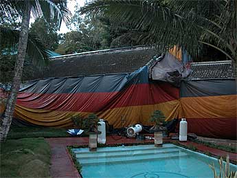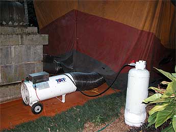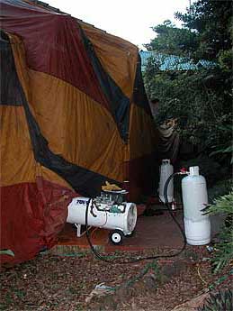 Using toxic gases was out of the question, so we put if off, year after year. But then recently a new option was found: heat treatment. The buildings are tented and then hot air is blown into the building. The new technique was developed by scientist in California in the late 1980's and patented as the "Thermal Pest Eradication" system.