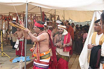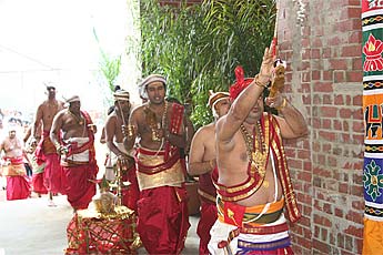 Now the priests are coming back for the last time. You can't see it in this photo, but there is a silver thread running from the yagnasala all the way to the Siva shrine. The chief priest is touching the thread all the way, to carry the power, and the thread is being wound up behind him