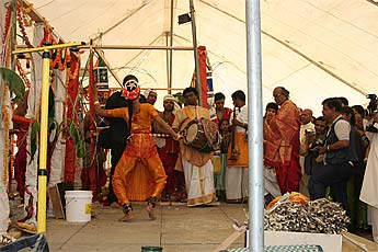 Various offerings are required during the final kumbhabhishekam morning, all leading up to the final pouring of kumbhas. Here is a short dance performance.