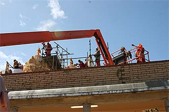 And the long awaited moment...the kumbhas are poured simultaneously over all three towers for Ganesha, Siva and Devi