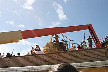 Entering through the brick skeleton of future 14-meter-tall rajagopuram