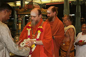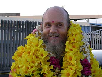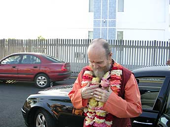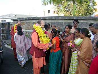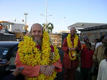 Here is Bodhinatha, arriving in Mauritius where he was greeted with giant garlands....