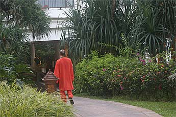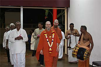 Entering the temple hall for the meeting. Dato Vythilingam next to Bodhinatha.