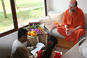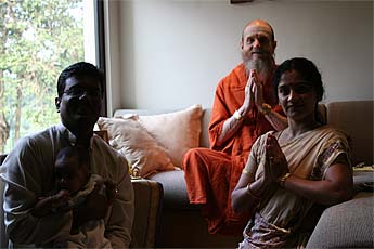 Later that afternoon, we meet with Selladurai and family. In this photo, Puventhira is having his school pencils blessed by Bodhinatha because he is about to have exams.