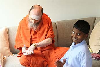 Eight-year-old Hiranyavaha has Bodhinatha sign his personal copy of the Dancing with Siva pocketbook