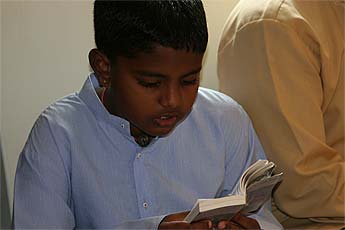 Though only age eight, Hiranyavaha has already learned a lot of English at home and is an avid reader. He wanted to read a lesson out loud from Dancing with Siva. He did quite well!
