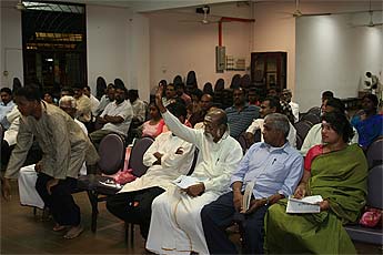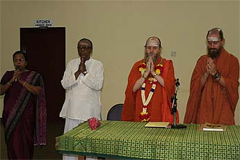 A. Selvam of Sampoorna Printers, standing just to Bodhinatha's right. They print our Master Course books in full color. His son Prakash accompanies the meeting, along with a couple friends.