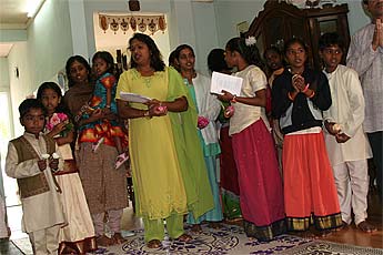 Visiting some sishyas families at the home of Kulapati Mougam and Kulamata Saranamutha Pareatumbee in the town of Flacq. Here the children are singing a song in English that praises Bodhinatha.