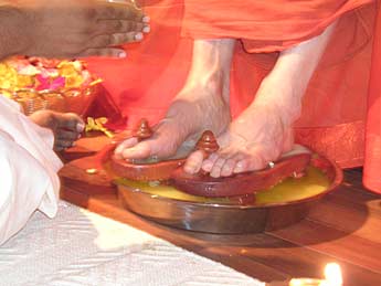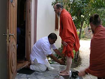 Sivakumaran performs the traditional pada puja to the arriving holy man...