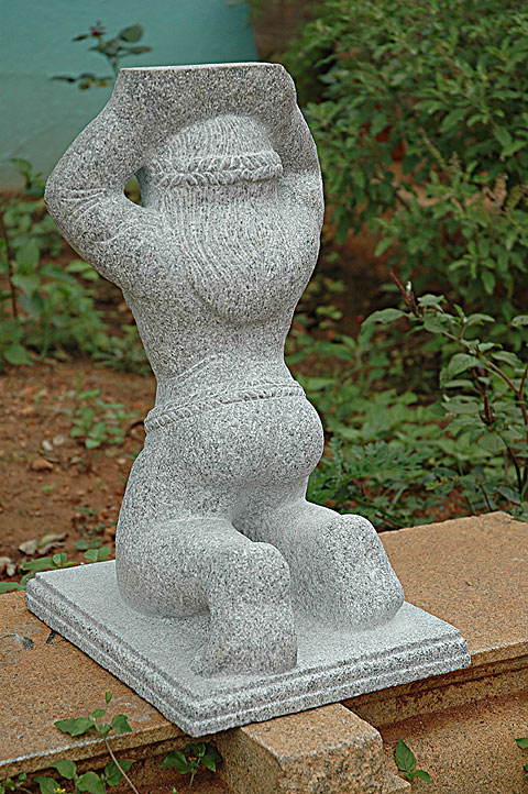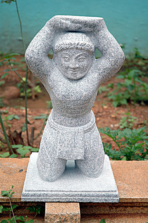 This stone is supported by a dwarf in traditional architecture. For Iraivan, we thought there is nothing more perfect for this than to have our own Kauaian Menehune hold up the stone, with his two hands above his head. The Menehunes are a race of stone builders who once inhabited our island, said to have been here before the current day Hawaiians. They were of tiny stature, a Lilliputian people yet stout and strong. In fact, they were the stone masons who built large tone water ponds and walls on Kauai. We felt they would be at home in a stone temple.