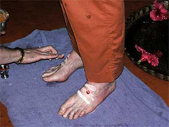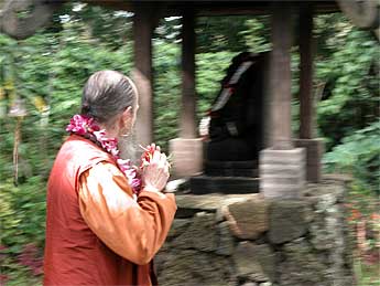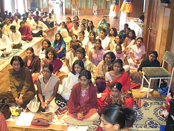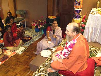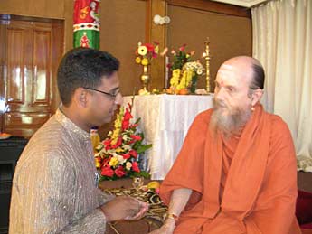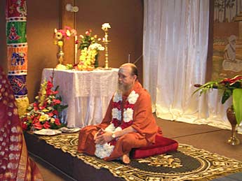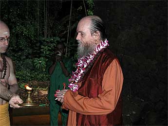 Satguru Bodhinatha Veylanswami takes his seat after a short Ganesha arati performed by Saravanathaswami at the little shrine on the left.