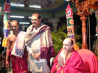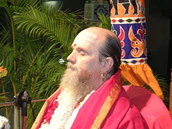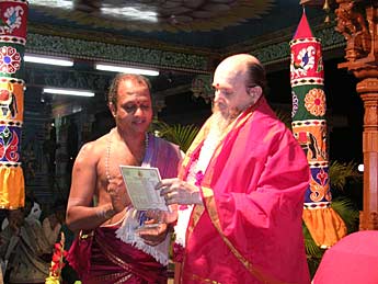 Bodhinatha gets ready for His Upadesha. Before Bodhinatha addresses those present, various socio-Hindu religious leaders welcomed Bodhinatha in each of the Indian languages spoken in Mauritius: Hindi, Telugu, Tamil and Marathi. A welcome message was also read in sanskrit.