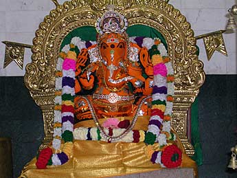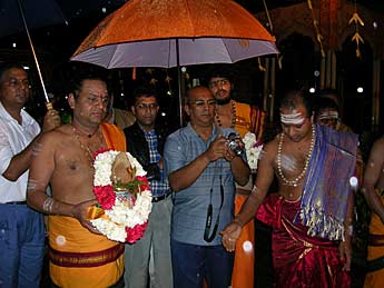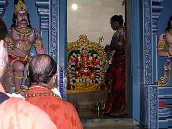 After parading around the Temple with traditional musicians leading the procession, Bodhinatha arrives at the Lord Ganesha's shrine where an arati is conducted...